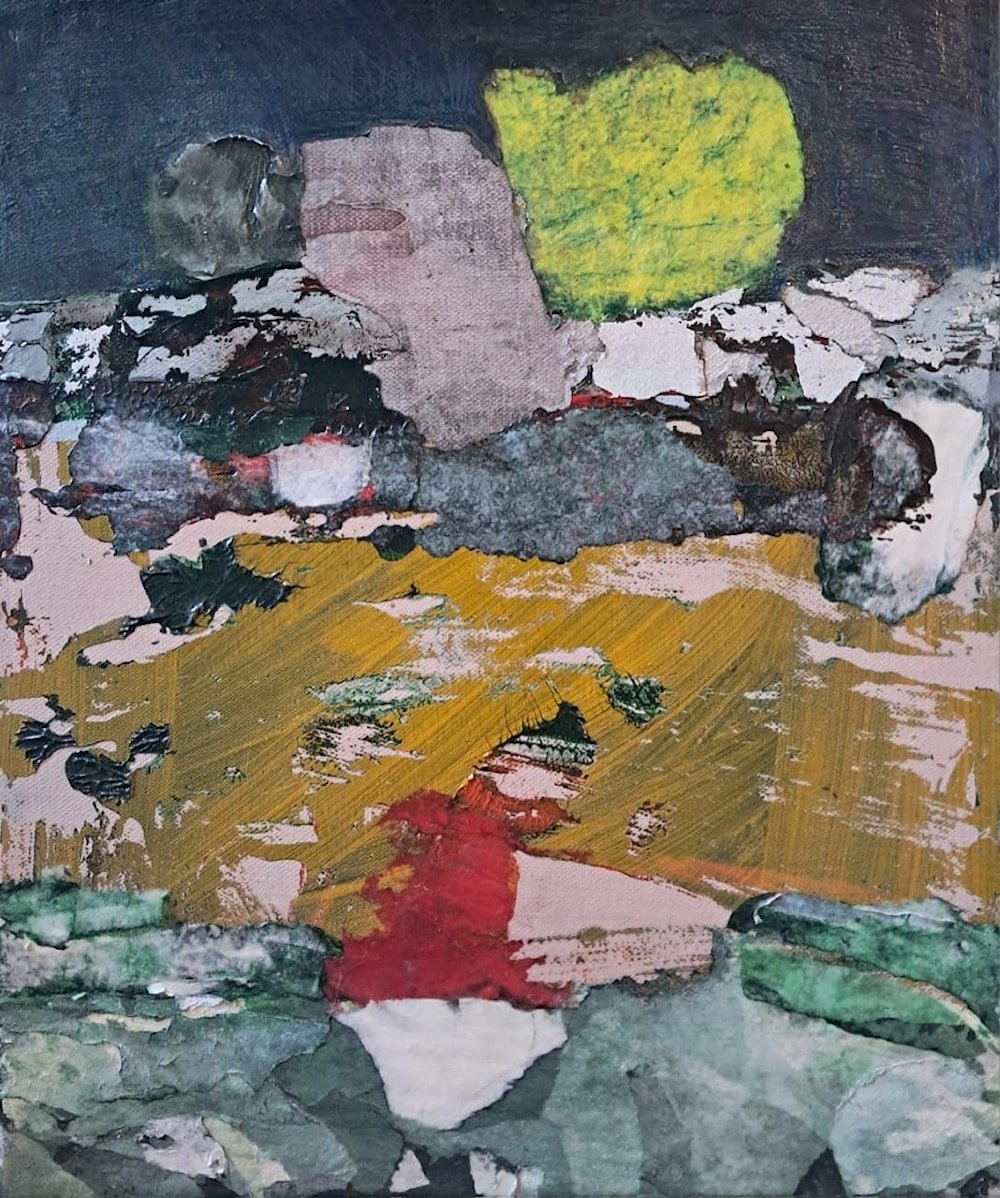 يستكشف عمل بيضون العلاقة بين الطبيعة والضوء والشكل، خالقاً مناظر طبيعية متخيلة تثير المشاعر والحنين من خلال نهج متعدد الطبقات باستخدام الألوان المائية والأكريليك والباستيل والوسائط المختلطة.