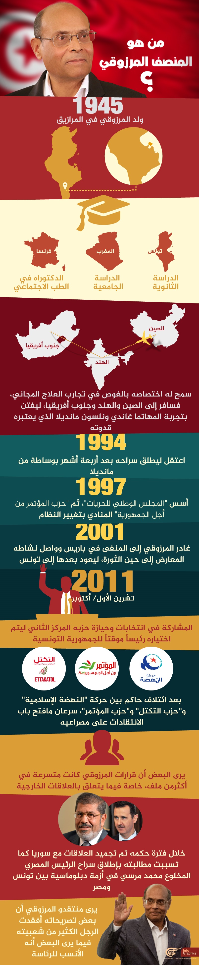 الرئيس التونسي المنصف المرزوقي يحاول البقاء في قرطاج بعد ثلاث سنوات من الحكم المؤقت. أصوات الناخبين في الجولة الأولى من الانتخابات الرئاسية تضعه اليوم في مواجهة مع رئيس حزب نداء تونس الباجي قايد السبسي في جولة الإعادة. فمن هو المرزوقي وبأية حظوظ يخوض السباق نحو قرطاج؟
