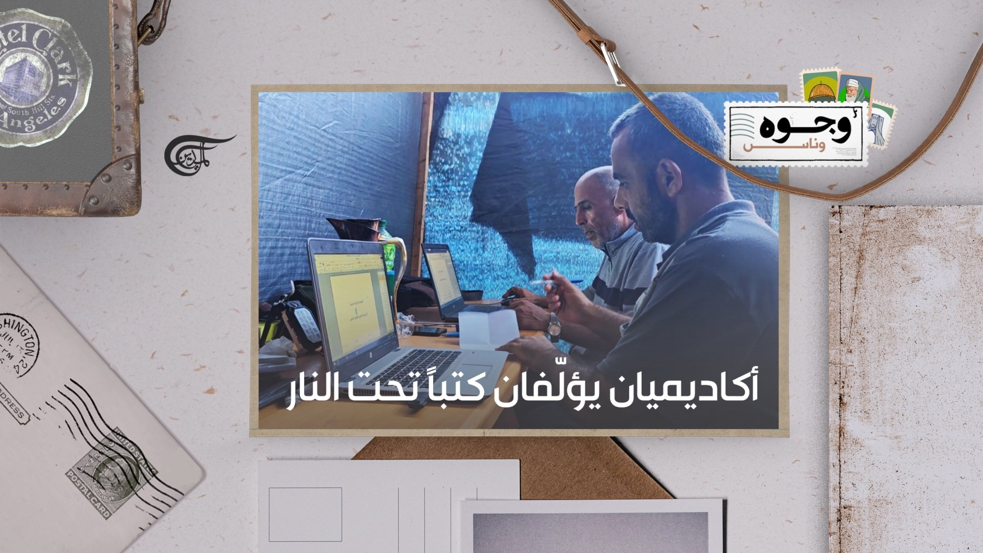 مُتحدّيان الموت والنار والدمار، الكاتبان والأكاديميان الفلسطينيان مازن الشوبكي ومحمود النجار يتمّمان، من داخل خيمتهما، شماليّ قطاع غزة، إعداد كتاب من 750 صفحة متخصّص بربط التكنولوجيا بعلم الإدارة.